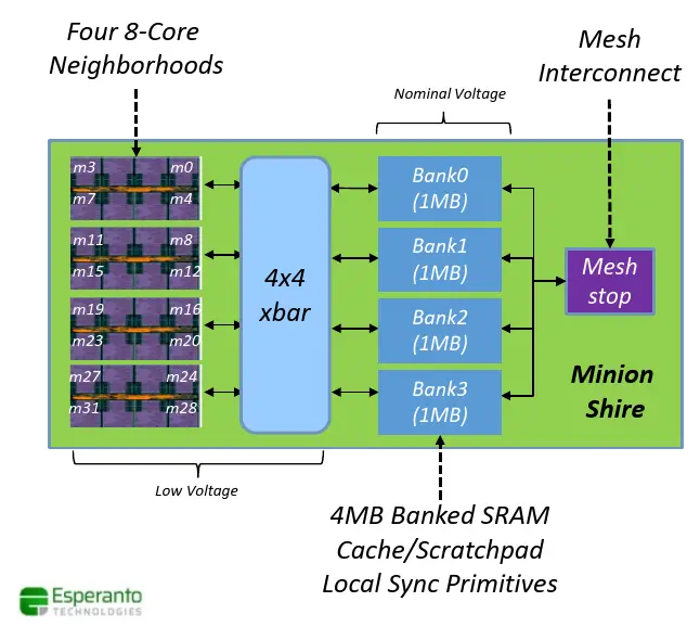 由于 ET-Minion 采用低压设计,其各个单元以及交叉开关位于 Shire 内部独立的低压电源层上。Shire 的其余部分(例如,分组式 SRAM 和网状互连组件)则位于标准电压层上。