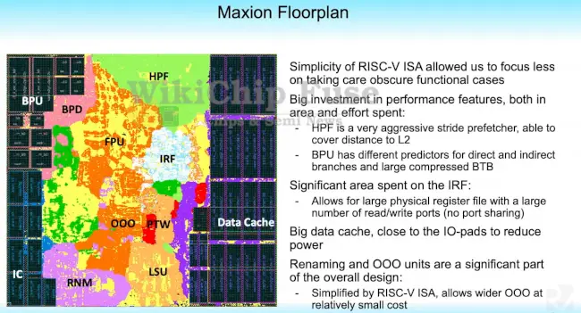 Esperanto 最初考虑过定制指令集架构 (ISA),但最终还是选择了 RISC-V,因为它更简单。该公司解释说,这种简单的架构让他们能够将更多精力集中在性能特性上,而不是费力地去解决其他 ISA 的各种特殊情况和怪癖。ET-Maxion 的平面图如下所示。请注意,图中显示的是核心部分,没有 L2 缓存。从芯片布局图可以看出,缓存阵列(几乎占总面积的 1/3)和分支预测单元占据了相当大的面积。核心顶部是硬件预取器 (HPF)(仅支持 L1 缓存),与其他组件相比,它的体积非常大。选择更激进(速度更慢但精度更高)