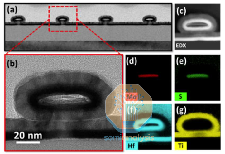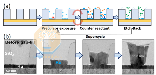 通过精心设计的“超循环”步骤,利用臭氧刻蚀去除侧壁上多余的晶核,实现完美的自下而上填充。更重要的是,沉积的钌在热处理后发生重结晶,最终形成近乎单晶的结构。这使得垂直电流方向与低电阻的 c 轴完美平行,从而最大限度地提高了器件的导电性能。