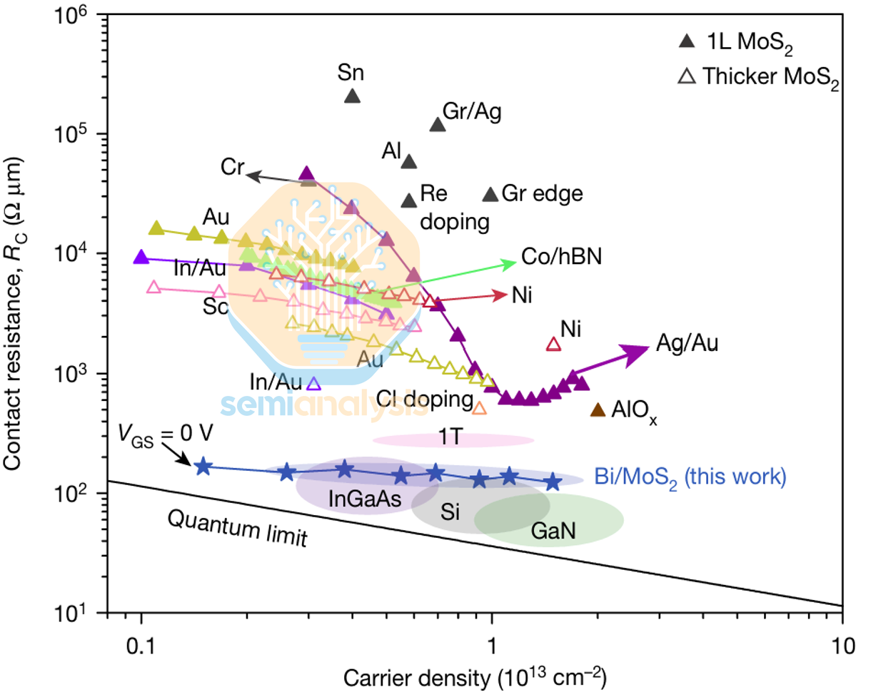 一旦接受了近期的挑战在于集成,那么下一个挑战将更加严峻:接触。为了满足工业要求,器件性能必须得到提升,而接触电阻一直是关注的焦点,因为它决定了器件是否受接触限制。大量先前的研究报告指出,在特定的接触方案下,MoS₂ 的 n 型接触电阻很低,但需要注意的是,这些结果通常是在高 VGS 和 VDS 电压下获得的,而这并非产品实际应用的关键偏置电压范围。相关的目标工作电压范围是低电压工作,即 |VGS| < 1 V,|VDS| < 0.1 V,接触电阻 Rc < 100 Ω·µm。这重新定义了目标:需要在低偏置电压下实现高载流子浓度,这样 Rc 才能在实际工作条件下(而不仅仅是在过驱动条件下)接近量子极限。