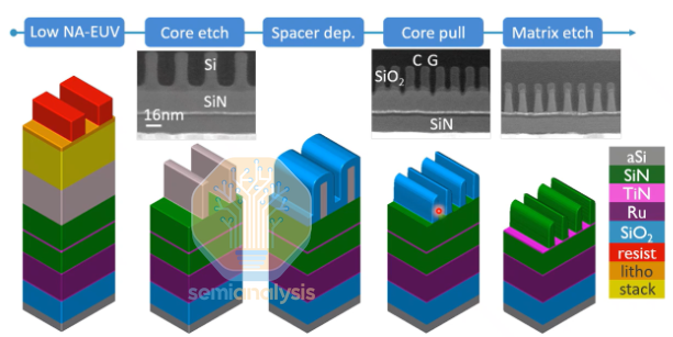 A7 节点:在此节点引入了 18 纳米或 16 纳米的间距。一旦达到 16 纳米间距,它可能代表了单次曝光、高数值孔径 (High-NA) EUV 光刻技术所能达到的实际极限。