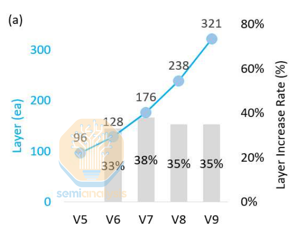 当每层刻蚀层数无法增加时,就必须增加刻蚀层数。这会增加大量的加工步骤。海力士表示,从 V8 到 V9,总加工步骤增加了 30%,蚀刻步骤增加了 20%。WFE(晶圆级刻蚀)的拥趸们,别高兴得太早,层数增加的幅度接近 35%,也就是说,层数的增长速度比加工步骤的增长速度更快。