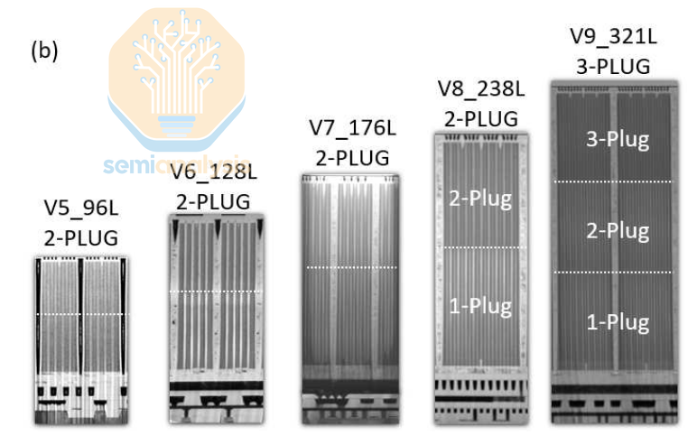 从 238 层的 V8 代到海力士 321 层的 V9 代,主要变化在于增加了一个层级和一个塞子。层级是由水平堆叠的导电层和绝缘层交替组成,所有层一次性完成加工。首先沉积各层,然后进行触点的图案化和部分蚀刻(每个导电层都需要一个触点来访问由该层控制的晶体管——这就是存储器的字线),最后蚀刻沟道孔,并用多晶硅和周围的电荷陷阱层填充。图中的“塞子”指的就是这个填充完毕的沟道,它用来堵住孔洞。