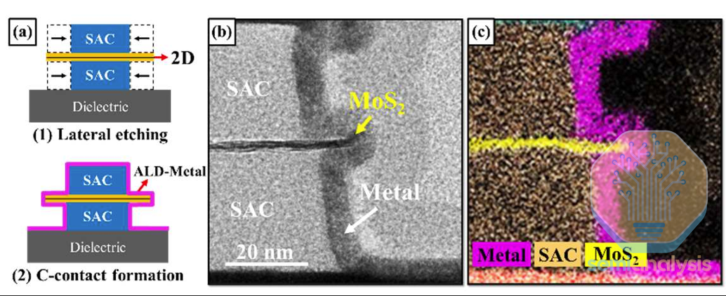 此时,接触几何形状不再是次要细节,因为它决定了能否大规模重复构建“良好接触”方案。最佳接触几何形状仍存在争议,纯粹的顶接触或纯粹的边缘接触结构在生产中难以稳定实现。一些研究提出 C 型接触、混合型或组合型拓扑结构作为可制造的途径,第一性原理计算表明,类似 C 型接触的结构(包括非范德华夹层接触)具有更优的性能。发展方向很明确:业界正趋向于以可制造性为导向的折衷方案,理论理想不再那么重要,能够克服工艺偏差并提供可接受的电阻率的几何形状才是关键。