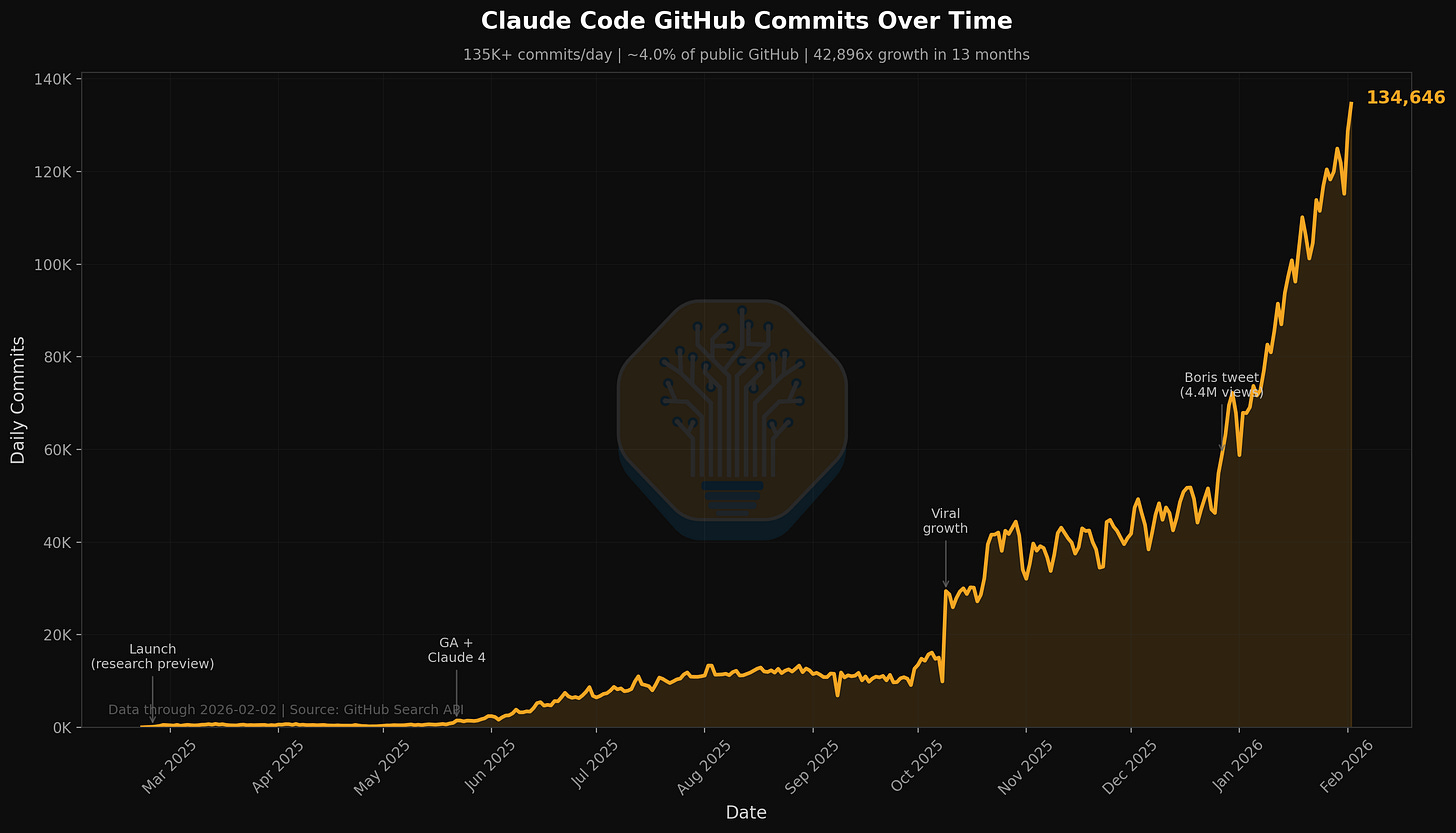 目前,GitHub 上 4% 的公开提交都出自 Claude Code 之手。照此发展趋势,我们预计到 2026 年底,Claude Code 的每日提交量将占到总数的 20% 以上。转眼间,人工智能已经席卷了整个软件开发领域。