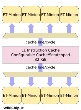 将八个 ET-Minion 分组,就形成了 Esperanto 所说的 Minion 邻域。在邻域内,每个核心竞争性地共享指令缓存。缓存容量为 32 KiB。每个周期,一条缓存行会被发送到两个核心。换句话说,指令缓存会在每个周期轮询一对核心,将 64B(相当于 16 条指令)的数据发送到两个不同的核心。核心会缓存这条缓存行,以便在指令缓存继续向其他核心提供数据时,它们能够继续运行。