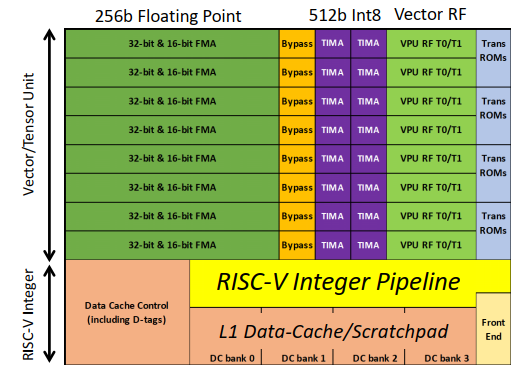 除了向量单元之外,ET-Minion 还集成了一个向量超越单元,它可以执行各种三角函数、指数函数和对数函数等超越函数运算,从而加速诸如激活函数之类的计算。该超越单元基于 ROM,相比硅芯片而言,功耗更低。这里的向量单元还有一些其他的细微差别。除了标准的 RISC-V 指令之外,Esperanto 还实现了自己的指令扩展——两个。他们添加了多周期张量指令和相应的向量超越指令。一些读者可能会对此感到不安,尤其是在 Esperanto 如此大力宣传 RISC-V 的优势之后。但事实是,RISC-V 与所有其他指令集架构 (ISA) 一样,没有任何专门用于加速 AI 的指令,因此这些扩展是必要的。事实上,RISC-V 基金会预见到了这一点,并将自定义扩展直接嵌入到规范中,这就是为什么世界语能够以标准方式实现这一点的原因。目前尚不清楚世界语是否会公开其扩展,或者他们是否打算将其保持专有状态,因为这与他们声称的面向未来相悖。