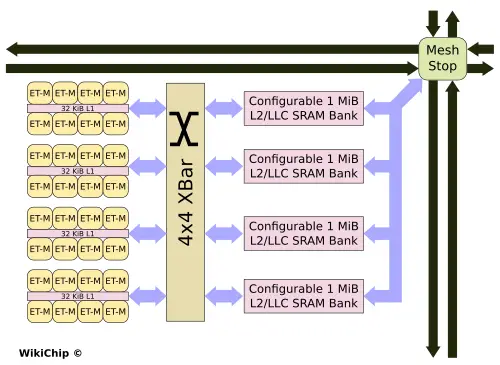 由于 ET-Minion 采用低压设计,其各个单元以及交叉开关位于 Shire 内部独立的低压电源层上。Shire 的其余部分(例如,分组式 SRAM 和网状互连组件)则位于标准电压层上。