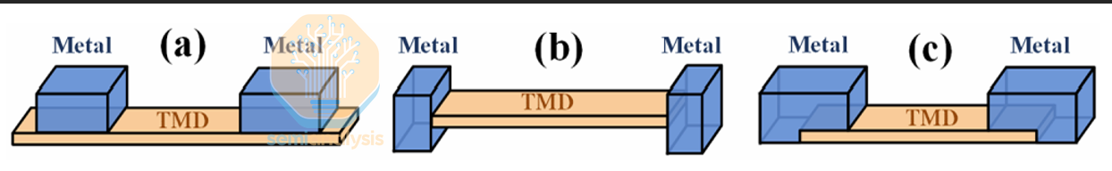 此时,接触几何形状不再是次要细节,因为它决定了能否大规模重复构建“良好接触”方案。最佳接触几何形状仍存在争议,纯粹的顶接触或纯粹的边缘接触结构在生产中难以稳定实现。一些研究提出 C 型接触、混合型或组合型拓扑结构作为可制造的途径,第一性原理计算表明,类似 C 型接触的结构(包括非范德华夹层接触)具有更优的性能。发展方向很明确:业界正趋向于以可制造性为导向的折衷方案,理论理想不再那么重要,能够克服工艺偏差并提供可接受的电阻率的几何形状才是关键。
