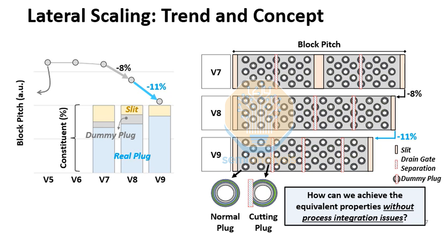 当每层刻蚀层数无法增加时,就必须增加刻蚀层数。这会增加大量的加工步骤。海力士表示,从 V8 到 V9,总加工步骤增加了 30%,蚀刻步骤增加了 20%。WFE(晶圆级刻蚀)的拥趸们,别高兴得太早,层数增加的幅度接近 35%,也就是说,层数的增长速度比加工步骤的增长速度更快。